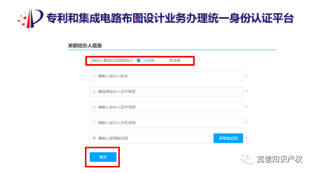 最上方經(jīng)辦人是否已注冊自然人:如經(jīng)辦人有個(gè)人賬號(hào),選擇已注冊輸入注冊信息點(diǎn)擊提交即可。